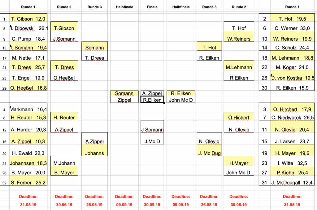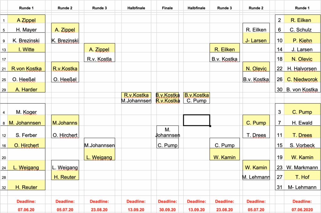 • Die Gruppenspiele sollen bis Ende Juni beendet sein, die Viertelfinals bis Ende Juli, die Halbfinals bis Ende August und das Finale bis Ende September. Bei Terminschwierigkeiten könnt ihr euch an die Captains wenden.
