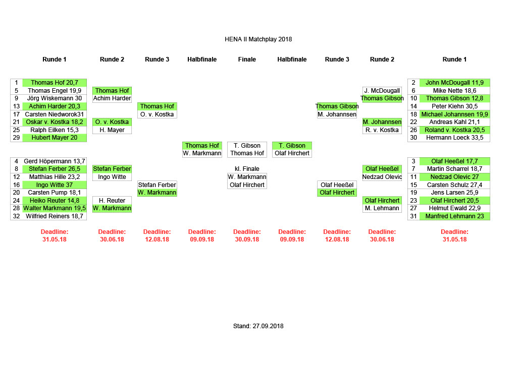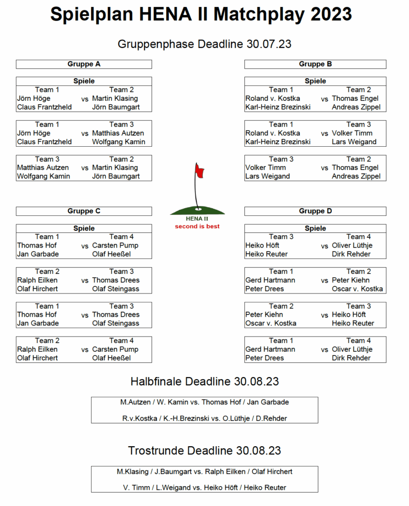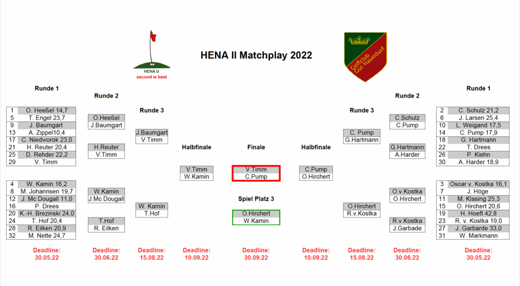 Das HENA II Matchplay findet außerhalb des Wettspielkalenders statt und erfreut sich in jedem Jahr großer Beliebtheit. Traditionell wird die erste Runde im Rahmen der Saisoneröffnung ausgelost. Das Format ist nicht in Stein gemeißelt. Vom klassischen Matchplay über Teamwettbewerb bis hin zu Gruppeneinteilung war schon alles mal dabei. Tolle Preise für die Gewinner sind obligatorisch. Aber seht selbst was bisher geschah.